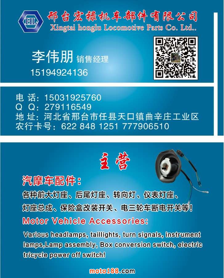 河北邢臺宏祿機車部件有限公司:主導產品有:摩托車各種型號(前大燈座)、(后尾燈座)、(保險盒)