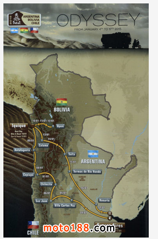 本屆比賽的賽事總里程超過9000公里,其中特殊賽段長度為4600公里,包括從玻利維亞城市Uyuni到智力城市Pacific Coast長為781公里的特殊賽段。本周日,車手們將從布宜諾斯艾利斯出發(fā),踏上艱苦的賽程。