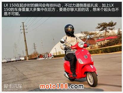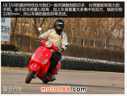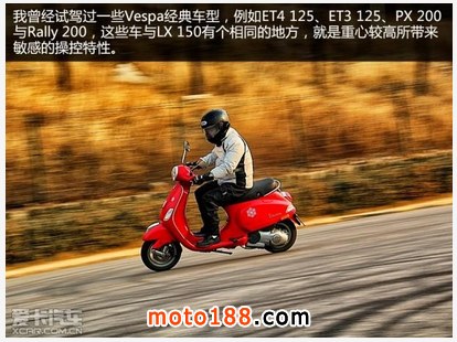 若你曾經騎過需要換擋的Vespa,肯定會對它的操控有很深的印象!事實上,LX 150的操控表現比起以往二沖程的Vespa可說是親切許多!因為在ET4出現之前,所有Vespa的發動機是被安裝在車身右側,并且以齒輪直接驅動(少數車款如PK車系有自動變速箱),配置三擋或四擋變速箱,擋把設置在左手把上,透過旋轉手把換擋。因為這樣的配置,所以早期的Vespa車身重心有偏右的傾向,而且后剎的力度很大,所以很容易造成后輪抱死、甩尾的現象。但是從ET4之后開發的新車款,機械結構與現在的踏板車則大同小異(發動機為水平放置、采用CVT變速箱),而我們這次試駕的LX 150,基本上也維持了這樣的架構,所以在動力輸出、操控表現上,都比以往車款親切許多。