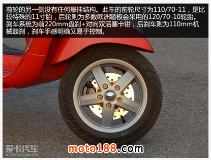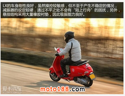 與歐洲汽車一樣,Vespa的行路感也比日系、臺灣踏板來得更扎實些,我們推測這是因為Vespa在發動機吊架中,使用了較厚的橡膠襯墊,再加上車身剛性較強,所以遇上路面不平處的沖擊感較小,不過減振器的設定較硬,所以高速壓過坑洞時,也不會讓車身產生不穩定的晃動。