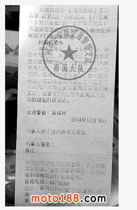 2014年12月16日,肇慶摩友陳先生騎摩托車經(jīng)過番禺鐘村105國道時,恰好遇到交警路邊執(zhí)法。其停車后出示了行駛證、駕駛證、身份證等證件。