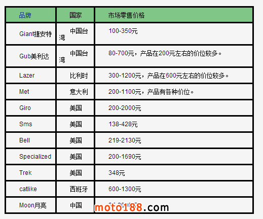 表2-2012年中國主要品牌自行車頭盔市場零售價格