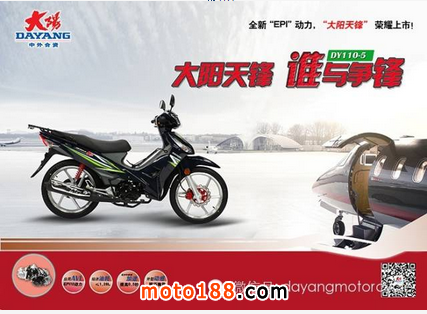 大陽2015年彎梁新品"天鋒"(DY110-5)懸掛北易公司自行研發的“EPI110-M”型發動機,具備分層燃燒、精準配氣、振動平衡、耐久性匹配等四大核心技術,動力更強、油耗更低、壽命更長!