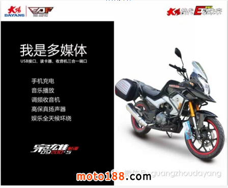 核心提示: 大陽梟雄DY200-5旅行版摩托車集手機充電、音樂播放、調頻收音機、高保真楊聲器于一身 當你在網上沖浪手機木有電時,梟雄能