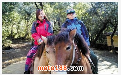 一月十二日,于鵬和周亞玲在麗江拉市海的茶馬古道騎馬留念