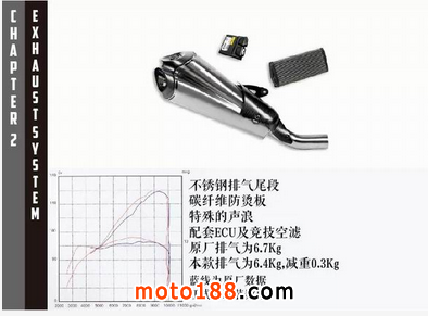 碳纖維全段,這款排氣不僅動力有所提升,而且它的重量比原廠排氣減輕了足足4.2kg,全套還配備有ECU及競技空濾。