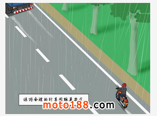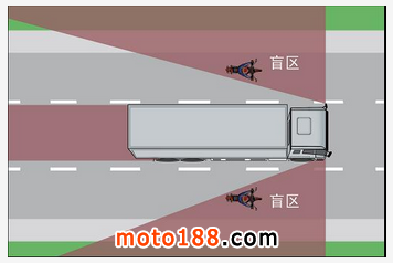 摩托車在道路上行駛應(yīng)盡可能避開大型車輛。大型車輛因高度和長(zhǎng)度的關(guān)系,會(huì)在車輛周邊產(chǎn)生一定的視覺盲區(qū),一旦大型車輛突然變更車道或緊急剎車,極易引發(fā)交通事故。另外,大型車輛快速通行時(shí),形成的氣流會(huì)對(duì)周邊較近的物體產(chǎn)生一定的吸力作用,如摩托車靠得太近,則易引發(fā)被卷入車底的交通事故。