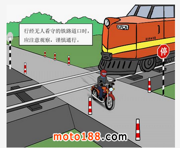 (4)行經(jīng)無(wú)人看守的鐵路道口時(shí),應(yīng)做到“一停、二看、三通過”,禁止在道口內(nèi)停車;行經(jīng)有人看守的鐵路道口時(shí),應(yīng)服從道口管理人員的指揮,在欄桿開始下降時(shí),禁止強(qiáng)行闖桿,與火車搶行。