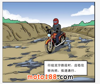 (6)行經(jīng)泥濘路段時(shí),應(yīng)選用適當(dāng)擋位,保持足夠的動(dòng)力,穩(wěn)住轉(zhuǎn)向把,均勻一次性通過。通過長(zhǎng)泥濘路段時(shí),應(yīng)中途停車熄火休息,以防止發(fā)動(dòng)機(jī)溫度過高。通過泥濘路段時(shí),應(yīng)停止加油,必要時(shí)下車推離泥濘路段,否則車輛會(huì)陷入泥潭,不斷打滑。