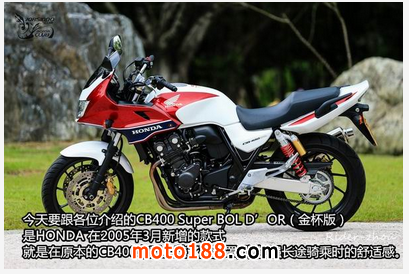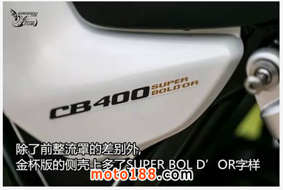 核心提示: CB400 SB版即CB400 SUPER BOL D'OR 在國內很多摩友也叫他CB400金杯版, 至于為何叫金杯版,主要是為了紀念法國著名耐力摩