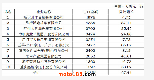 2015年1月國內(nèi)摩托車企業(yè)出口金額排名 TOP10