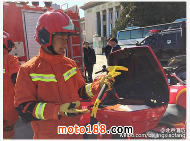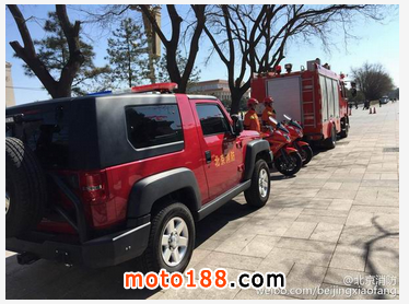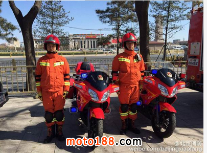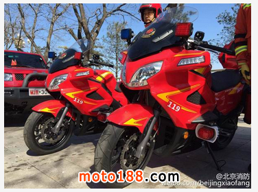 據北京市消防局官方微博“北京消防”消息,2015年兩會期間,北京消防的新型消防執勤摩托車,配備有小型滅火器和破拆工具,具有靈活機動、處置快速的特點。