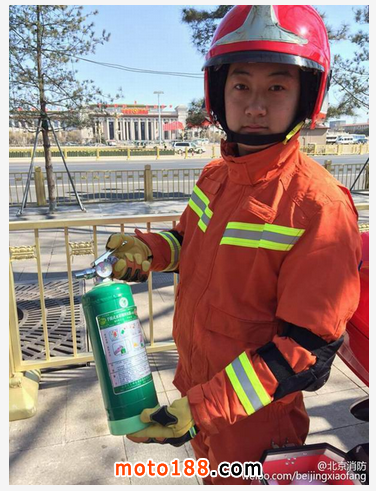 核心提示: 據北京市消防局官方微博北京消防消息,2015年兩會期間,北京消防的新型消防執勤摩托車,配備有小型滅火器和破拆工具,具有靈