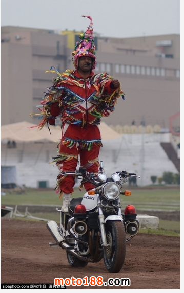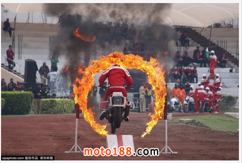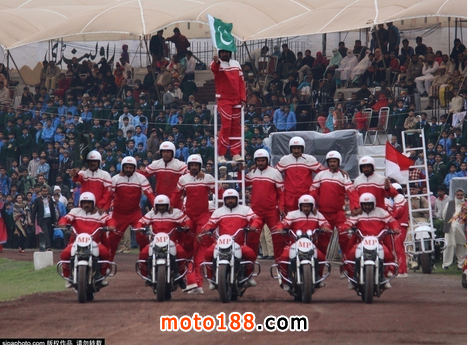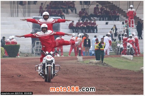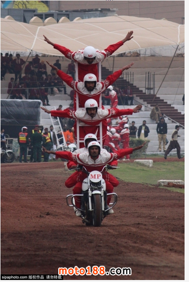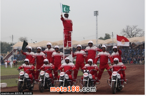當(dāng)?shù)貢r(shí)間2015年3月6日,巴基斯坦拉合爾,第15屆國(guó)家家畜展覽會(huì)開幕式上,巴基斯坦人表演騎摩托車疊羅漢的高超技藝。看來(lái)南亞次大陸印巴都有這種秀摩托的文化耶。