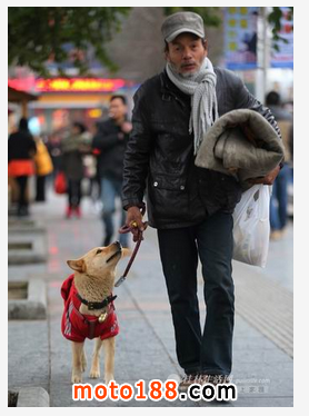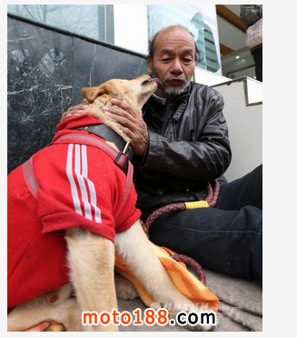 百貨大樓附近的一個角落里,一個胡子拉碴的老漢安靜地坐著,緊挨著他的是一只大黃狗。冷風中,老漢看上去有些縮手縮腳,大黃狗卻穿著衣服。老漢時不時伸出手輕輕撫摸大黃狗的脖子,大黃狗則仰起脖子,伸出舌頭舔一舔老漢,有幾次甚至舔到了他的胡須。