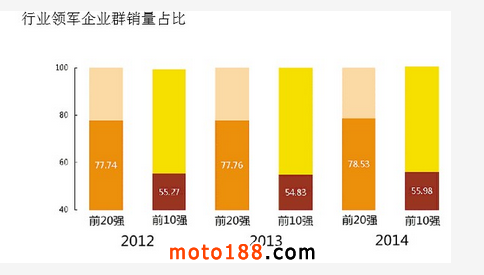 近3年的產(chǎn)銷數(shù)據(jù)表明,銷量前10名的企業(yè),銷量占比僅由2012年的55.27%提升至2014年的55.98%;銷量前20名的企業(yè),銷量占比僅由2012年的77.74%提升至2014年的78.58%;數(shù)據(jù)變化微乎其微。