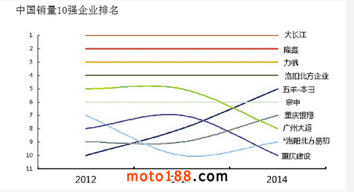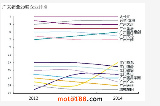 以廣東板塊為例,在前8名的競爭中,五羊-本田超越廣州大運(yùn),躍居第二;豪劍連續(xù)兩年超越三雅、天馬,躍居第5.在追趕者梯隊中,江門華龍由第18名,連續(xù)跳躍,坐上了第13名的位置。2014年,江門華龍的銷量達(dá)到了78284臺。