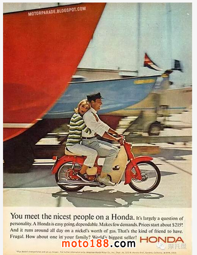 在二戰后,許多退伍老兵喜歡騎上哈雷,控訴社會對軍人的忽視,發泄著憤怒,而當時的美國黑幫成員也喜歡騎摩托進行一些不光彩的活動。這些都給摩托形象帶來了極大的負面影響,而本田努力地改善社會對摩托的偏見,向美國市場投放了大量的廣告,著重樹立其有趣,休閑快樂的形象。讓更多的人接受摩托車。 1958年推出的超級幼獸(super cub)的一系列廣告改變著人們的觀念,而這時也產生了本田歷史上經典的一句廣告語:You Meet the Nicest People on a Honda.(你會在本田摩托上遇見最好的人)。一系列溫馨的廣告漸漸地使未接觸過摩托車的人也開始嘗試這迷人的機械。