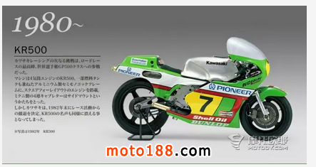 KR500是由川崎在1980年制造的500cc賽車,該車首次亮相是在1980年的GP賽場,車手是Kork Ballington。這位南非車手最后以總積分第12名完成比賽。1982年KR500主要更改了Shouwa的避震,最后以第九名完賽,在本賽季中最好的成績是第六名,隨后該車退休。