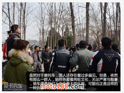 而對(duì)于車迷們來說,意大利則一個(gè)夢(mèng)幻般的天堂。法拉利、蘭博基尼、瑪莎拉蒂等一個(gè)個(gè)耳熟能詳?shù)拿郑阍醋杂诖恕.?dāng)然,還有那些歷史同樣悠久的摩托車,雖然這在國(guó)內(nèi)仍屬于“小眾”文化,雖然對(duì)于摩托車,國(guó)人還存在著過多偏見。但是,依然有那么一群人,他們始終熱愛著“兩輪”文化,無論嚴(yán)寒與酷暑,“騎車”便是他們?nèi)松械囊淮髽肥隆?赡芤舱沁@樣的一種執(zhí)著,才將他們聚集在了一起。