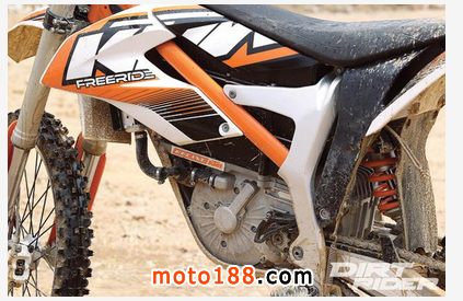 當你跨上FreerideE時,你完完全全能感受到各個部件配合得天衣無縫的感覺。盡管它的動力裝置與傳統感覺不一樣,但它的鋼鋁結合的車架有著優秀的人體工程學,使得駕駛者騎乘姿勢非常棒。車輛座高為大約35英寸,所以感覺車子大小比較適中,相比一輛250CC四沖程摩托它更像一輛85CC的摩托。車把和腳踏位置合適,除了平坦的坐墊,它就像傳統的越野摩托一樣。非常有趣的是,KTM從胡薩博格借鑒了它高強度塑料副車架的技術。此外它使用了85 sx的減震,因此它的209磅的車重操控也十分扎實。當沖進粗糙路面和從坡上往下沖時,我注意到車輛穩定性非常好,阻尼表現得非常優秀。WP PDS對震動過濾非常快速,使得你感覺沖擊似乎要小一些,但是它仍需要進一步的調教,使得快速過彎沖擊較大時減震不至于壓縮太多。