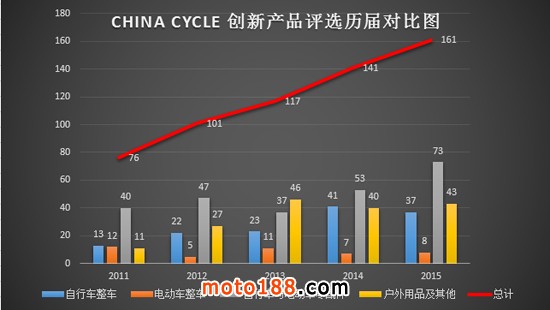 本屆創(chuàng)新產(chǎn)品評(píng)選活動(dòng)自2014年11月20日起開始報(bào)名,向參加“2015中國展”的參展商征集近年來創(chuàng)新產(chǎn)品,在為期3個(gè)月的時(shí)間里,共收到161件參評(píng)產(chǎn)品,其中自行車整車37件,電動(dòng)車整車8件,自行車、電動(dòng)車零部件73件,戶外用品(騎行裝備)43件,報(bào)名數(shù)量與上屆相比增長14%。