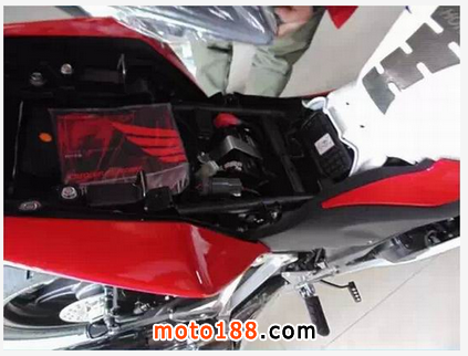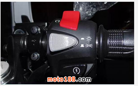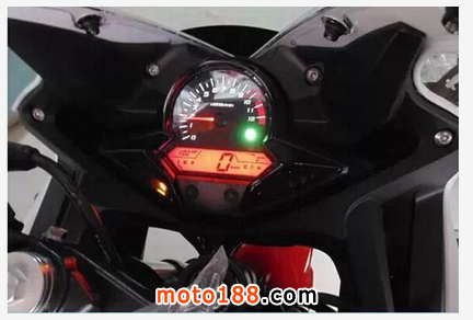 通電后,整個儀表系統除了發動機轉速表是傳統機械儀表顯示外,其余的都是數碼儀表顯示,儀表整體上圓下方,甚是有型。當然,沒有國內用戶較為關心的檔顯。可能是因為都騎公路跑車了,還不熟悉檔位嗎?