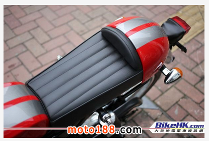 一如當(dāng)年的GP跑車,77的車身擾流用上圓潤的線條。車頭加入了圓頭燈,與其它部位的圓潤互相呼應(yīng)。擾流的款式亦充滿復(fù)古味道,沒有硬朗的骨位,亦沒有任何導(dǎo)風(fēng)槽,上下兩幅擾流一氣呵成。油缸的款式長而窄,但也有13公升的容量。紅色油缸上可以找到銀色賽車線條。車頭配上傳統(tǒng)的正立前叉,車尾用雙彈簧避震。排氣設(shè)在車身右邊,啞黑色的尾鼓是最簡樸的圓錐形。車頭的制動(dòng)用上單碟剎,車尾是機(jī)械鼓剎。儀表采用小巧的款式,只有指針及一行警示燈,不設(shè)LCD屏。車速表上的刻度以160km/h為終結(jié),而轉(zhuǎn)數(shù)表則在約7500rpm列入紅區(qū)。77配上的是五前速波箱,配合了整體的風(fēng)格。座鞍的線條一如油缸般長而窄,眼前的77并不是單座型號(hào),因?yàn)檐嚿肀緛砭鸵呀?jīng)有后座腳踏。座鞍上的是單座蓋,拆下之后就變回雙騎。前后沙板的款式亦十分懷舊,再加上把手尾的后鏡就更加有韻味。當(dāng)然,鋼線輪圈配內(nèi)膽輪胎,也是貫徹到底的復(fù)古。。