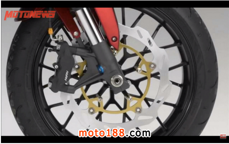 前方為倒立式前叉搭配NISSIN輻射對四卡鉗&浮動碟盤。