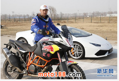 新華社供本報體育專電 一場備受關注的兩缸后驅“山野之王”挑戰V10四驅“公路猛獸”的跨界對抗昨日在北京八達嶺長城腳下的延慶機場舉行。結果,越野摩托車在三輪對抗中全部敗給超級跑車。