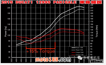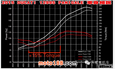先說說引擎,Engine由1198cc撥大到1285cc,個piston bore比1199大了4mm到116mm,壓縮比是12.6:1,而這幅引擎要用上全新設計的活塞,Liner,新曲軸,新連桿。結果1299得出的馬 力是205匹,大1199差不多10匹,杻力145Nm,也比1199大10多Nm。