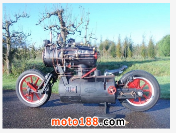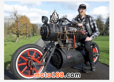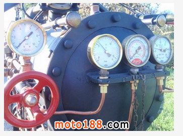 荷蘭Revatu Customs車輛改造工作室推出了一輛摩托與蒸汽火車頭混合版蒸汽摩托車,其炫酷夸張的造型讓蒸汽迷愛不釋手,各種壓力閥門、機軸驅動的后輪,騎上去異常拉風!其速度必然同蒸汽火車一樣不忍直視咯,每小時僅能跑5英里。