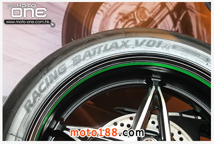 配備了最新款落場用的BRIDGESTONE V01光頭胎,前后輪框是跑車慣用的17吋輪框,車輛配備循跡系統等裝備,還有車輛配備跟ZX-10R相同的電子釘把,前避震是新款擁有全調校的KYB前叉,調校位置全設于叉頂上。掣動系統是頂級的BREMBO M50煞車卡鉗。