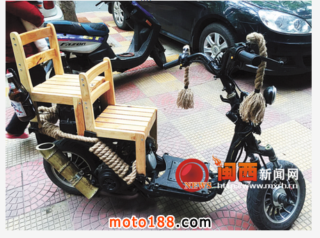 記者湊近觀察,發(fā)現(xiàn)這輛小摩托的有點(diǎn)古典美,細(xì)節(jié)處做得相當(dāng)有創(chuàng)意。車(chē)把上懸掛著兩條麻繩制作的掛飾。兩個(gè)小木凳架上去,頗具層次感。小摩托的屁股后面綁著兩個(gè)小啤酒瓶,車(chē)主人給安上燈泡接上電線,便變成了剎車(chē)警示燈。竹筒往上一插,粗獷古樸的排氣筒便制作而成。