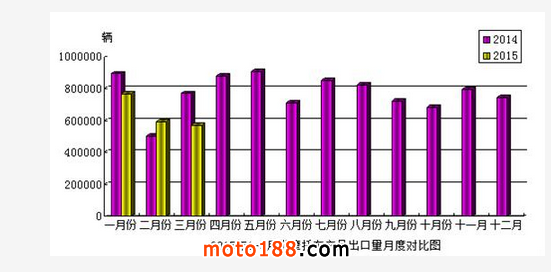 2015年3月份,摩托車產品出口57.09萬輛,比上月下降了3.88%,比去年同期下降了25.79%,出口金額3.10億美元,與去年同期下降了25.07%。