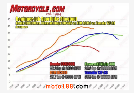 由圖示功率曲線可以看出,在需要常常保持高轉(zhuǎn)速的賽道中,KTM的實(shí)力是毋庸置疑的,而相比之下本田在高轉(zhuǎn)速區(qū)間的發(fā)力就弱得多。雅馬哈和川崎不相伯仲,但在中間轉(zhuǎn)速區(qū)域里川崎貌似有些“丟動(dòng)力”。
