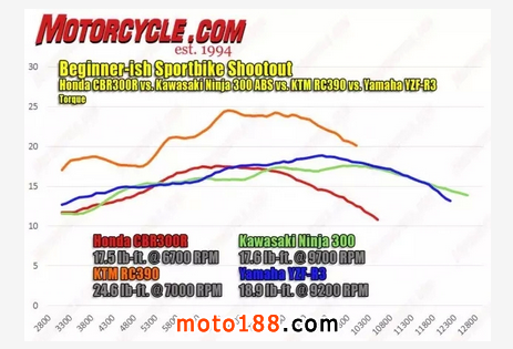 扭力曲線給我們帶來(lái)了額外的有趣信息,KTM依舊憑借排量的優(yōu)勢(shì)在這個(gè)環(huán)節(jié)繼續(xù)橫掃全場(chǎng),可是它的出力卻不夠線性,4500rpm左右扭力甚至比之前有所回落。川崎和雅馬哈奇虎相當(dāng)。本田在這個(gè)環(huán)節(jié)顯然墊底,不但可用轉(zhuǎn)數(shù)最少,發(fā)力區(qū)間也相對(duì)狹窄。