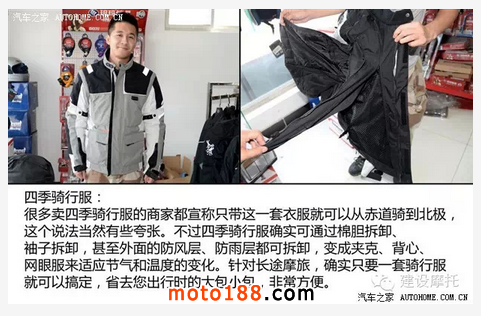據摩托護具店老板的介紹:騎行服最重要的是穿著舒適、合身,并且在發生摔車時可以起到保護騎行者的作用。對于一般的消費者來言,一件大小合身的騎行服,當你在騎行時應該幾乎感覺不到護具硬板的存在,這就證明它的版型設計適合你的身材。如果在騎行時你感覺到護具的位置很不舒服,或者沒有和身體貼合在一起,也許在摔車的時候就會錯位并削弱它的防護性。