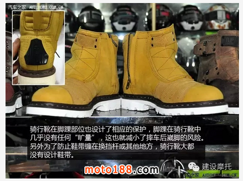 騎行鞋與普通鞋的區別之一,就是騎行鞋在腳背經常接觸腳擋的部位作了加厚處理,因為掛擋摩托車需要用腳挑擋位換擋,普通鞋子時間久了鞋面就會磨平、磨壞,而騎行鞋最大的特點之一就是耐磨。騎行鞋在腳踝部位也設計了相應的保護,它的包裹性較普通鞋子更好,迫使腳踝無法移位,防止了因為事故而造成的二次傷害。騎行靴的價格通常在300-2000元左右,專業的賽車靴會更貴。
