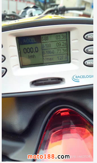 試車組架好D-Box儀器進行加速測試,BJ250的一檔起步表現(xiàn)不錯,離合器接合力道絲毫未見打滑,高轉(zhuǎn)起步前輪略有離地之勢,將轉(zhuǎn)速一舉提高后,一檔至三檔皆可感覺到明顯加速力,且各檔轉(zhuǎn)速接合綿密。若與BJ300相比的話,雖然加速力道沒有BJ300那么強烈,但是各檔位的齒比配置則表現(xiàn)得更好。實測0-100km/h加速僅花費9.2sec,加速明顯比試車組過去測試的GW250更快。車輛極速則出現(xiàn)在6檔10000rpm處,此時表速顯示142kmh,而D-Box儀器錄得實際極速為127.9km/h。