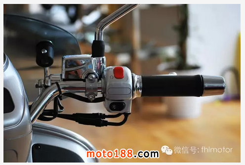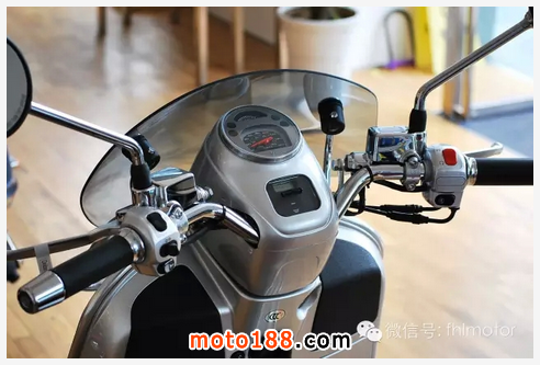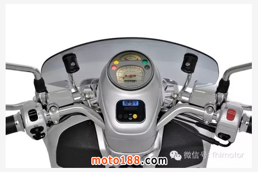 既然大燈下移,車頭部分自然清爽了許多。鍍鉻行李架,無燈設計車把加上擋風板,美觀、實用且對味!而儀表和車把更加有特點,有點類似于LXV車型,方向柱蓋采用機械圓形儀表,油量顯示和時速表完全分開,下方還有單獨時間顯示和功能提示燈,讓人一目了然。車把采用裸露設計,燈光控制鍵居左,啟動功能鍵居右。