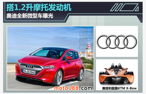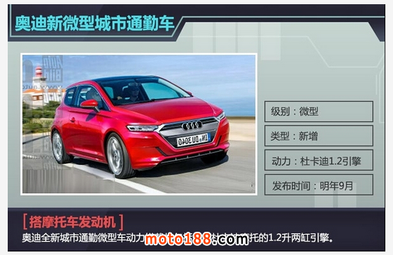 摩托車發(fā)動(dòng)機(jī)搭載在汽車上?如此“奇葩”組合在一起會(huì)產(chǎn)生什么化學(xué)效應(yīng)呢?這個(gè)現(xiàn)象在奧迪身上實(shí)現(xiàn)了。日前,網(wǎng)通社從芬蘭媒體worldcarfans獲悉,奧迪未來(lái)新動(dòng)向是將推出一款全新城市通勤微型車,競(jìng)爭(zhēng)對(duì)手瞄準(zhǔn)第二代大眾up以及斯柯達(dá)Citigo,新車動(dòng)力搭載將包括來(lái)自杜卡迪摩托的1.2升兩缸引擎,新車預(yù)計(jì)將在明年法蘭克福國(guó)際車展正式發(fā)布。