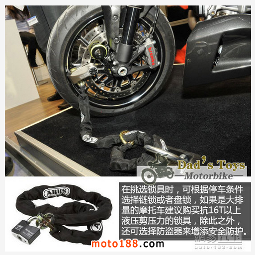 由于摩托車的重量相對汽車來說輕了不少,在停放和防盜方面也需格外注意,在挑選鎖具時,可根據停車條件選擇鏈鎖或者盤鎖,如果是大排量的摩托車建議購買抗16T以上液壓剪壓力的鎖具,目前市場上比較常見的鎖有臺灣狗王,西班牙的LUMA以及德國的ABUS等。除此之外,還可選擇防盜器來增添安全防護,不過由于防盜器比較耗電,如果超過一周沒有點火騎行,有可能會耗干蓄電池電力,當然這也跟使用頻率有關,建議大家如果裝了防盜器還是擱4、5天動動車,避免出現打不著火的尷尬情況。