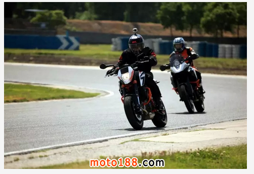 KTM的DUKE690R賽道測試后倪巍點評:在KTM全系列的車型中,是最適合我個人駕駛風格的一輛。首先車子身輕如燕,令車手可以毫無壓力的駕馭它。無論城市道路如何多變,也能輕松應(yīng)對。前后懸掛的行程較長,這點使它在郊外也可以得心應(yīng)手。在KTM家族中能算得上是個“多面手”車型。對于類似天馬賽車場的中小型賽道而言,此車能最大限度的包容車手在操作上的輕微失誤。因為具有靈便的操控和充足的制動力,它能呵護車手釋放出自己的最大信心感。雖然這車的動力和公升級是無法相提并論的,但功率重量比十分優(yōu)秀。特別是在出彎道加油門時,油門響應(yīng)十分靈敏毫不懈怠。如果你是特技愛好者,那這車是再適合不過了。無論車身的輕巧還是低扭的爆發(fā)力都能出色完成技巧動作。對于新手而言,暴躁的低扭矩和極為靈敏的制動真的是需要一段時間去適應(yīng),否則失控的情況難免出現(xiàn)。