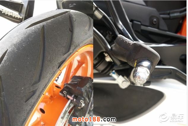 隨著在賽道中慢慢適應了RC390敏感的操控特性,漸漸地告訴自己要用更輕、更柔的動作駕駛這輛車,這輛車也便在彎道中跑得更快,直到壓彎下去的角度蹭到了腳踏上的安全釘,輪胎也就差最后幾毫米的極限磨到邊緣。我總是會擔心后輪會在彎里出現側滑,但這并沒有什么卵用——因為RC390用150寬度的象牌輪胎替代了Duke車型上本來就相當抓地的馬牌輪胎,你幾乎不可能讓RC390在彎道里側滑出去,除非你是故意的。