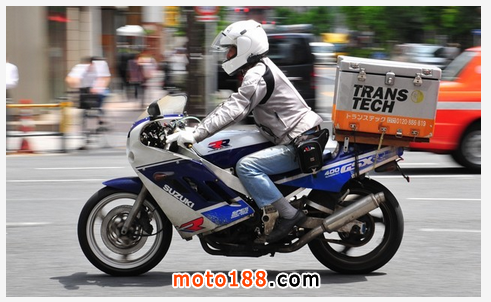 最開始的時候我還沒有搞明白怎么有人會在后座放這個大個的箱子,知道又看到幾輛“造型”相似的車子經過我才發現這是快遞公司的快遞員,在長焦端拉近之后才看到這款車的型號——鈴木GSX-R400,不過這個造型真的很有意思,后座的貨箱實在是太大個了。