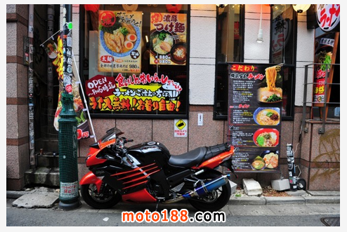 東京的拉面店就像是美國的塔可鐘快餐到處都是,有過之而無不及,這真的是填飽肚子的最佳選擇,尤其是天冷的時候一碗熱乎的拉面瞬間讓顧客感到生活的美好。繁忙的工作也讓很多顧客選擇叫一份拉面外賣,拉面這種食物比西餐漢堡更加講究進食時間,時間稍久面的味道口感就完全不同了,那么如何才能將外面在最短的時間內送到客戶手中?這家店給了一個答案——川崎ZX-14R,還有什么能比這個快?灼藍的排氣相當酷。