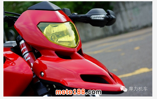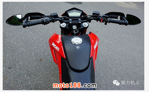 車頭,Hypermotard 796的大土除采用與車身相同顏色烤漆,搭配把手尾端的收折式后照鏡,以及越野車常見的謢弓,并在護工前端安裝方向燈,讓車頭的線條簡單又特殊。