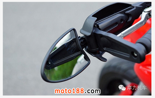 可收折的后照鏡,直接安裝于把手尾端,造型與護弓相呼應,不過在實用性上,這組后照鏡沒有比普通位置的后照鏡來得好用,可視角過廣的情況下,調整需要更費功夫,才能找到適合自己的后照鏡角度。