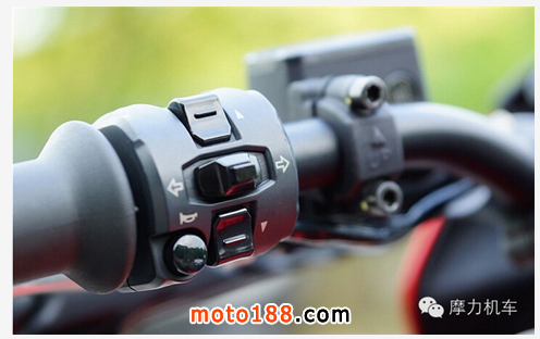 右把手部分,油門座采用大型重型較少見的單油門線,而把手開關部分,則有引擎熄火/啟動與電發按鈕,引擎電發按鈕在熄火開關撥到關引擎的情況時,會一起被遮蔽下來,以避免誤觸造成空轉的情況發生。